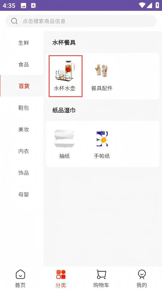 1、进入分类页面,选择【百货】类下的【水杯水壶】分类。