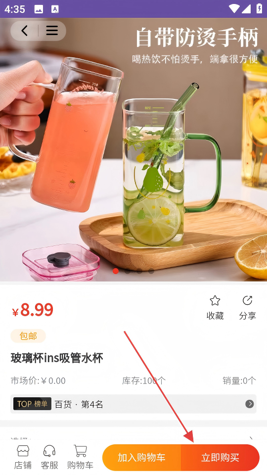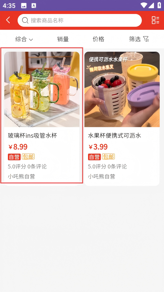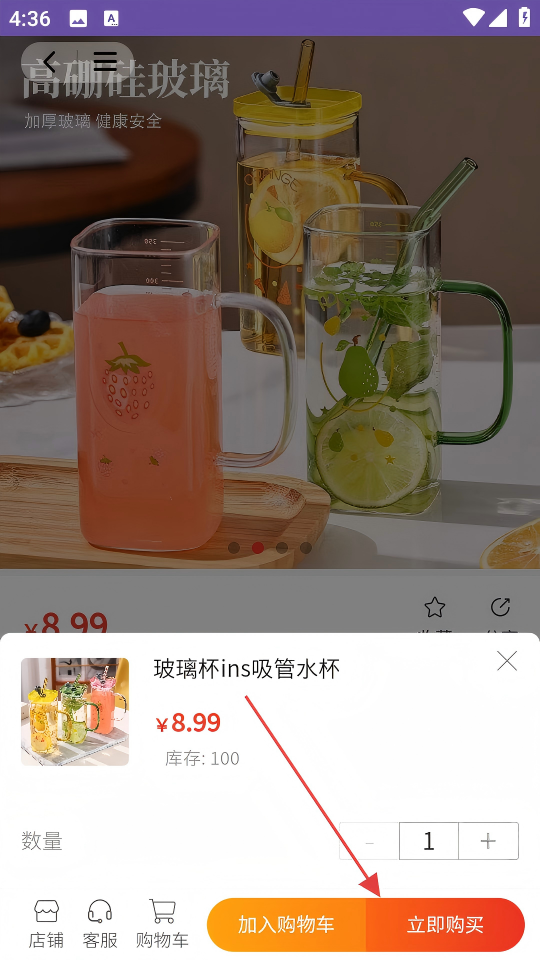 2、在水杯水壶商品列表中,挑选心仪的商品,如【玻璃杯ins吸管水杯】。