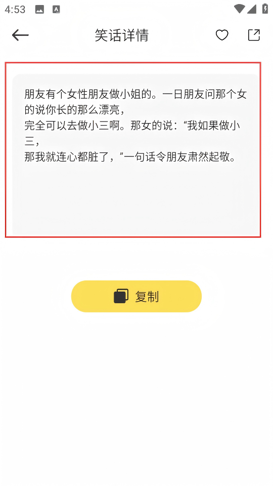 4、在笑话详情页,可阅读笑话内容,点击【复制】按钮,复制笑话文本。