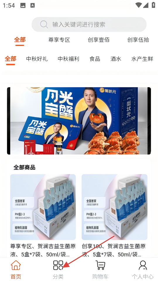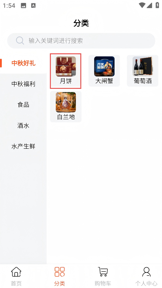 3、在【分类】页面,左侧可选择【中秋好礼】分类,右侧点击【月饼】图标,进入月饼类商品页面。