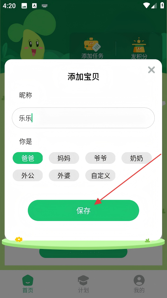 2、在“添加宝贝”窗口中,输入宝贝昵称,选择与宝贝的关系,点击【保存】。
