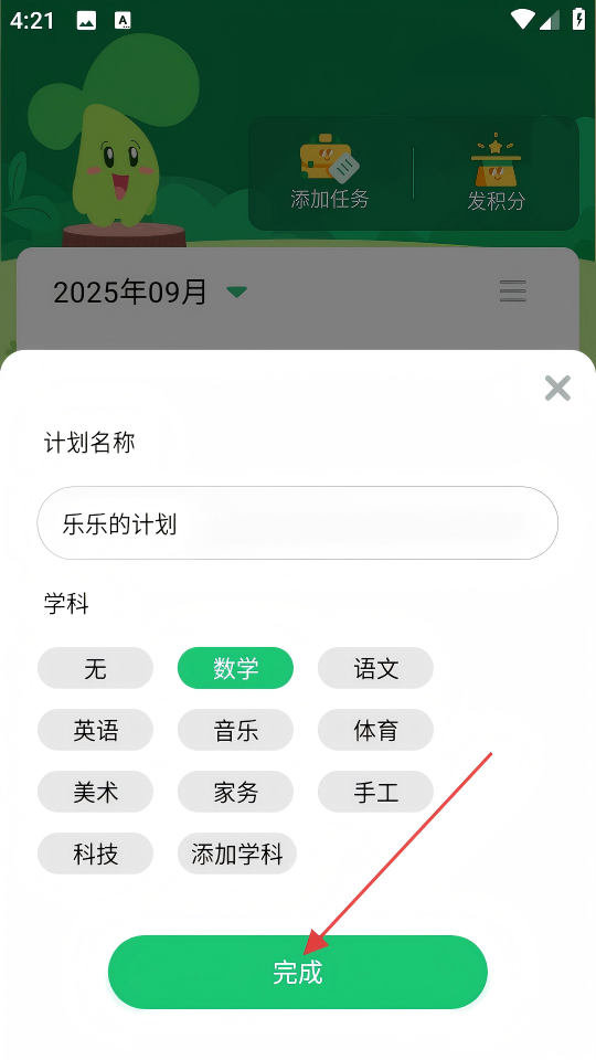 3、进入计划设置界面,输入计划名称,选择学科,点击【完成】。
