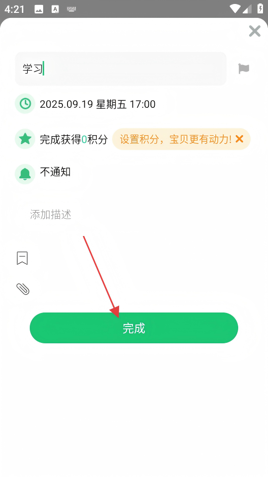 1、任务创建灵活:可根据孩子学习、生活场景创建个性化任务,自由设置任务时间,适配不同阶段孩子的任务管理需求。