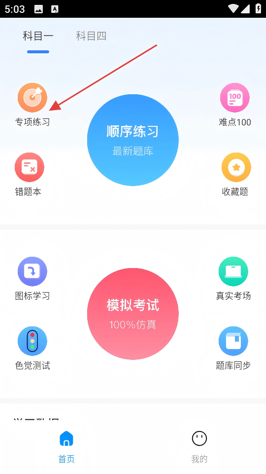 1、进入驾考APP首页,点击【专项练习】,进入科目一专项练习页面。