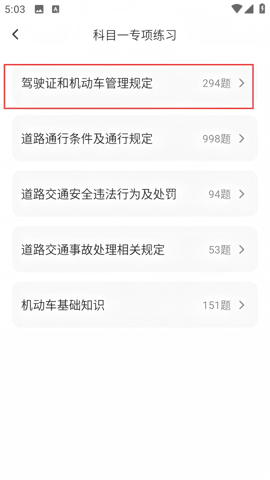 2、在科目一专项练习页面,点击【驾驶证和机动车管理规定】,进入该专项的题目练习界面。