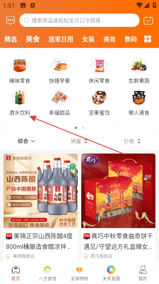 1、在APP首页,点击【酒水饮料】分类选项,进入酒水饮料商品页面。