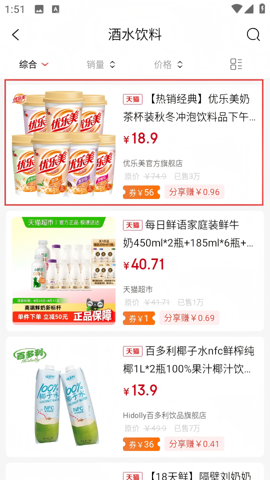 2、在酒水饮料商品页面,选择“优乐美”奶茶商品条目,进入商品详情页面。