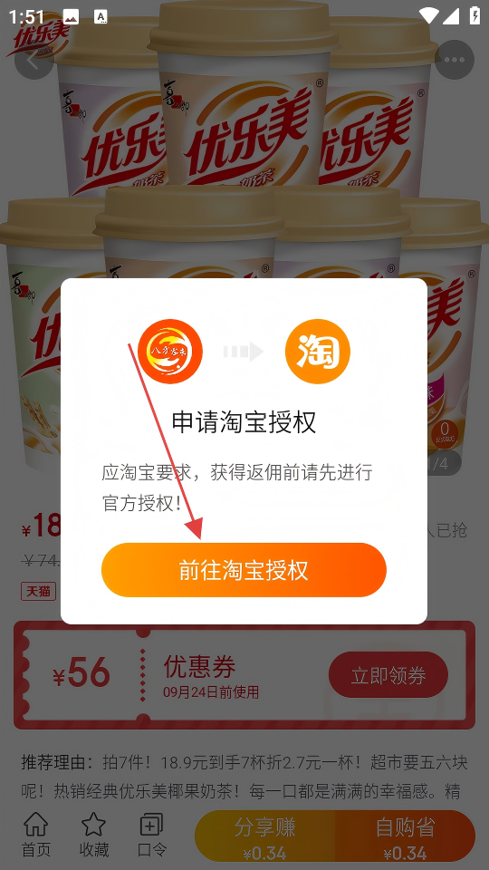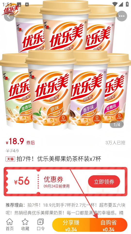 3、在商品详情页面,点击【自购省】按钮。