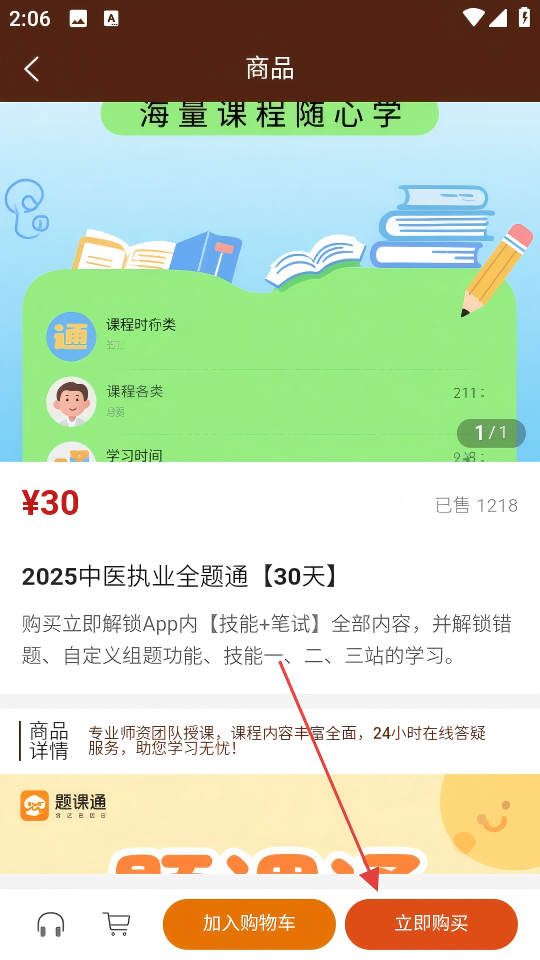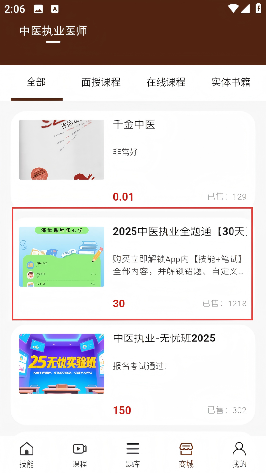 2、在商城页面,选择“2025中医执业全题通【30天】”课程条目,进入课程详情页面。