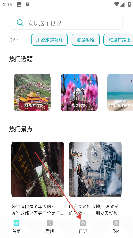 1、在APP首页,点击底部【日记】选项。