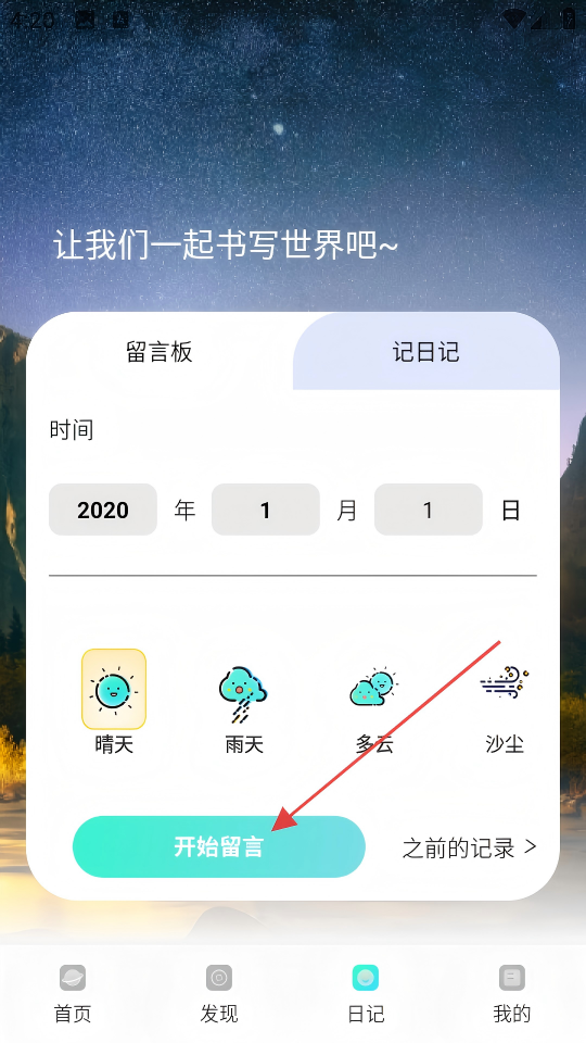 2、进入日记页面后,点击【开始留言】按钮。