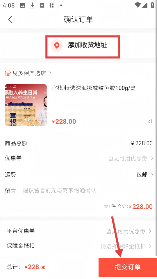 4、在确认订单页面,添加收货地址后,点击【提交订单】按钮,完成订单提交。