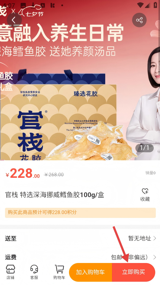 3、在商品详情页,点击【立即购买】按钮,进入确认订单页面。