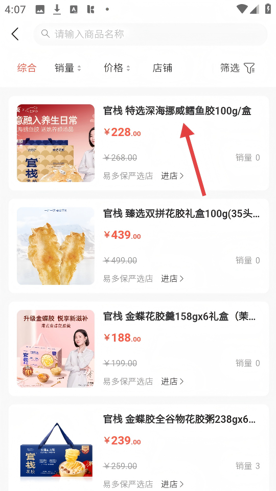 2、在营养保健商品列表中,点击【官栈特选深海挪威鳕鱼胶100g/盒】商品,进入该商品详情页。