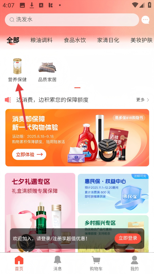 1、在首页点击【营养保健】分类,进入营养保健商品列表页。
