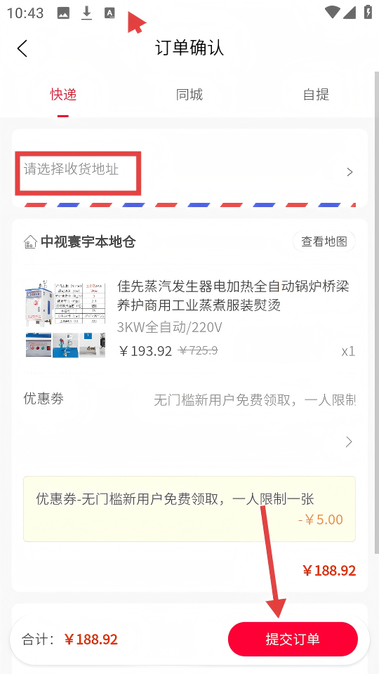 4、在【订单确认】页面,选择【请选择收货地址】后,点击【提交订单】按钮,可提交订单。