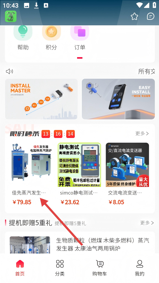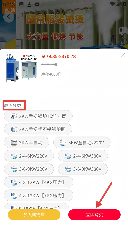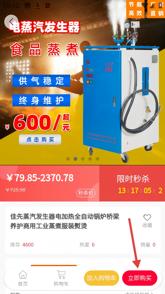 2、在【电蒸汽发生器】商品详情页,点击【立即购买】按钮,可进入商品规格选择等购买环节。
