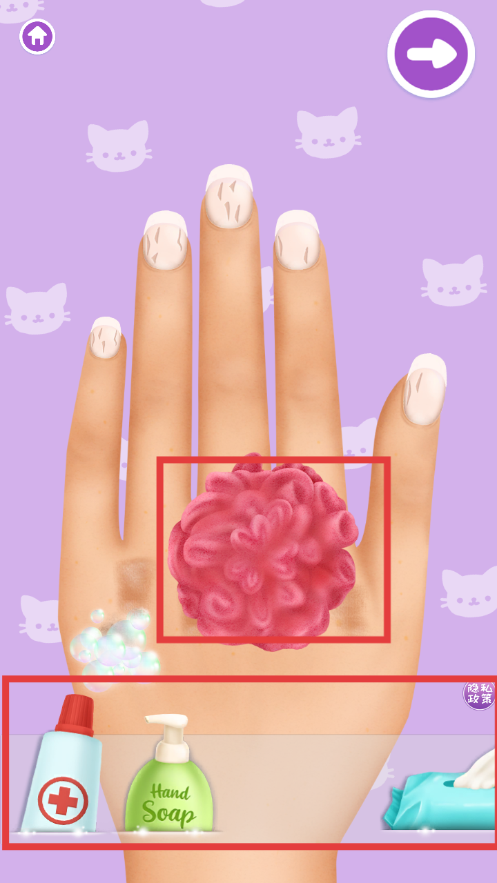 1、使用粉色花形海绵配合【Hand-Soap】等清洁用品,清洁手部污渍,为美甲做准备。