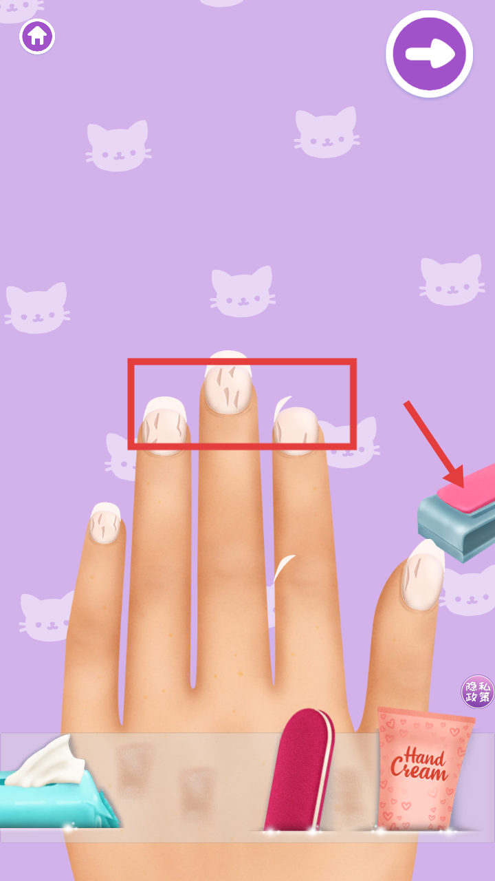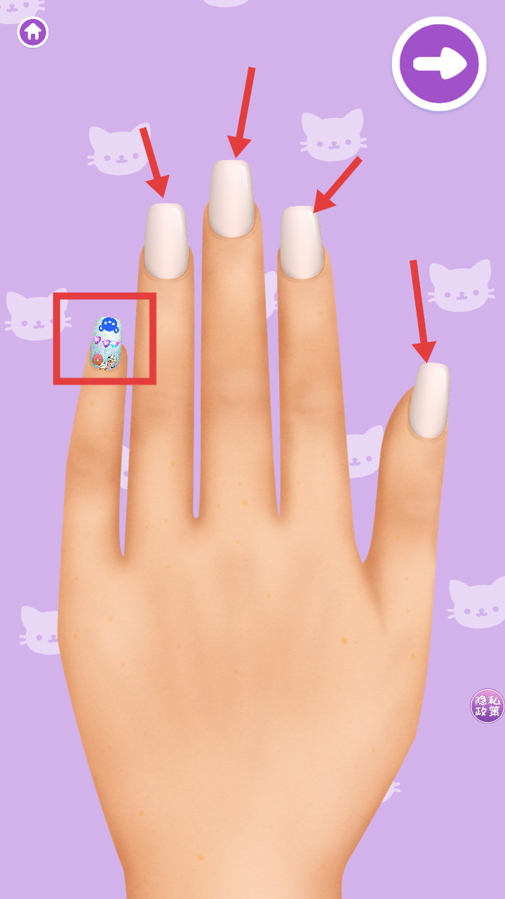 4、为其他指甲依次进行美甲操作,完成后点击右上角箭头,推进美甲流程。