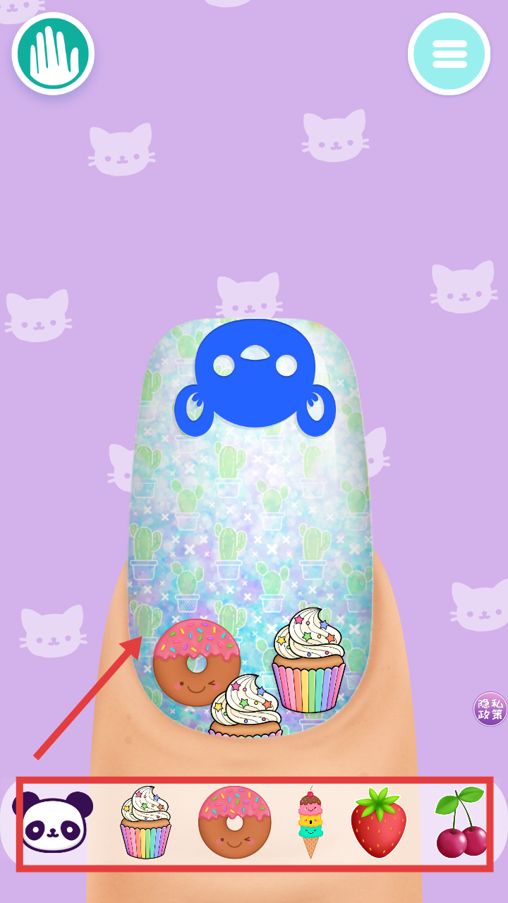 3、从底部选甜甜圈、纸杯蛋糕等可爱贴纸,贴在带有仙人掌图案的指甲上,增添美甲的趣味性。