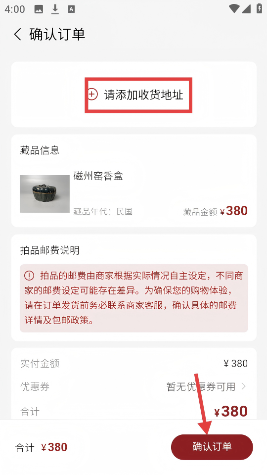 3、在确认订单页面,添加【请添加收货地址】后,点击下方【确认订单】。
