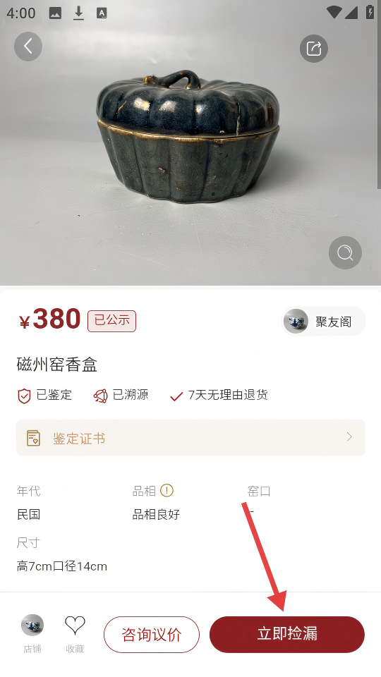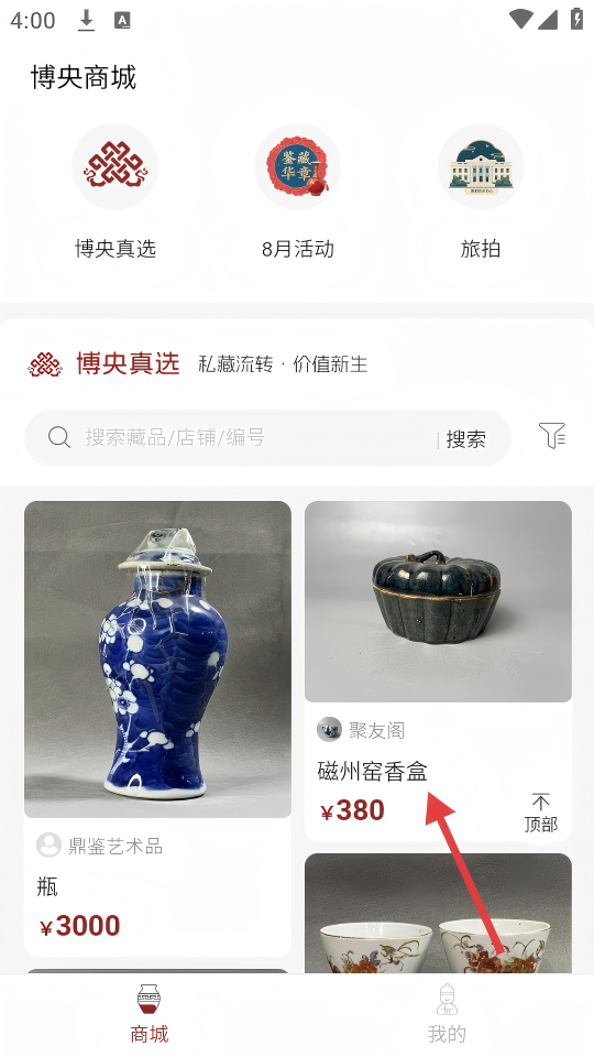 1、在博央商城首页面,点击【磁州窑香盒】商品,进入其详情页。