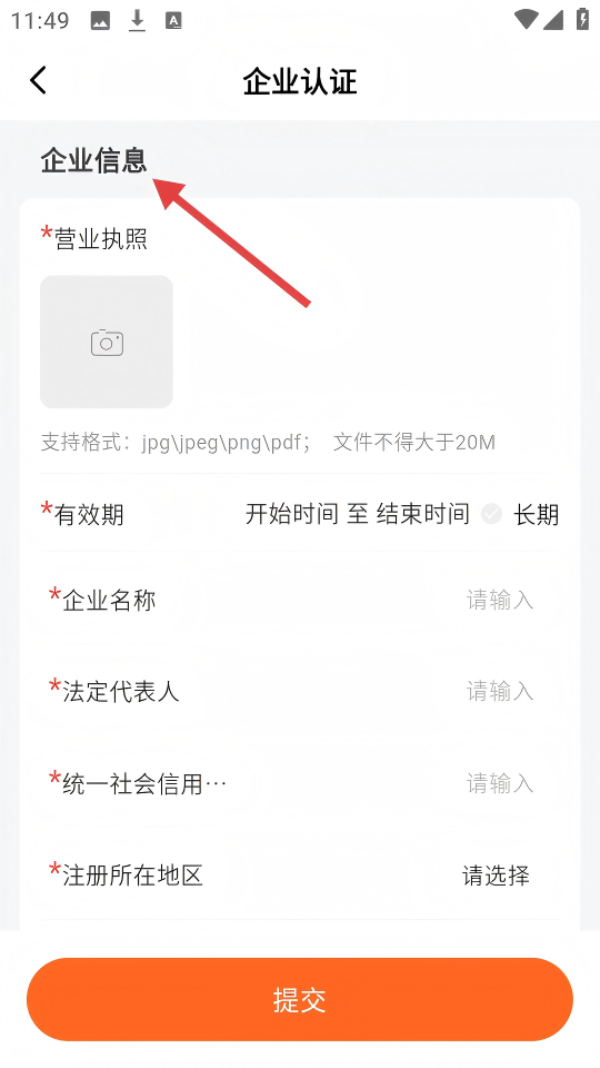4、填写【企业信息】中的【营业执照、企业名称】等各项必填内容。