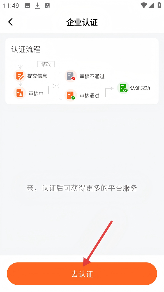 3、在企业认证页面,点击底部橙色【去认证】按钮。
