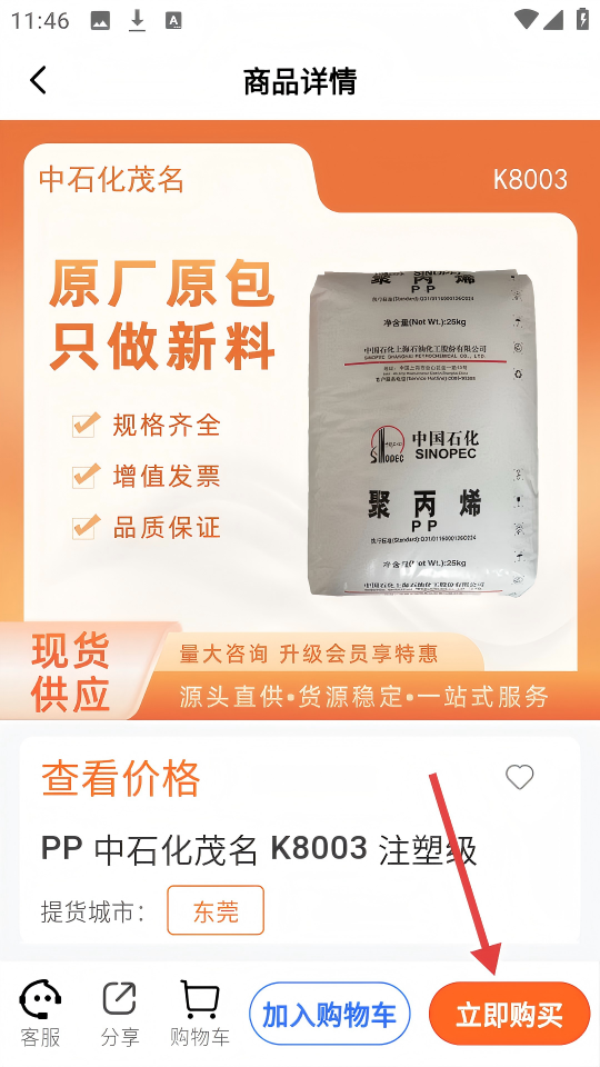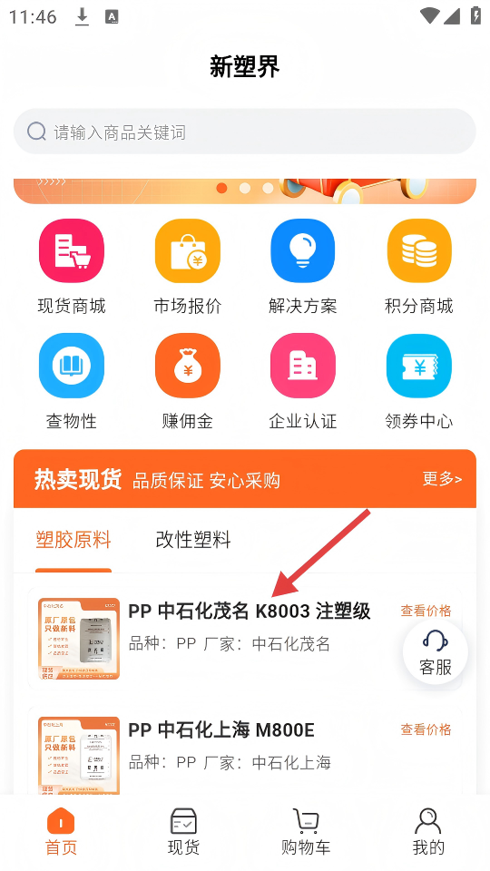 1、在新塑界首页,点击【PP中石化茂名K8003注塑级】商品卡片。