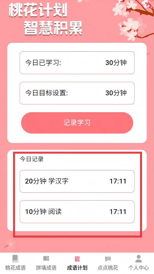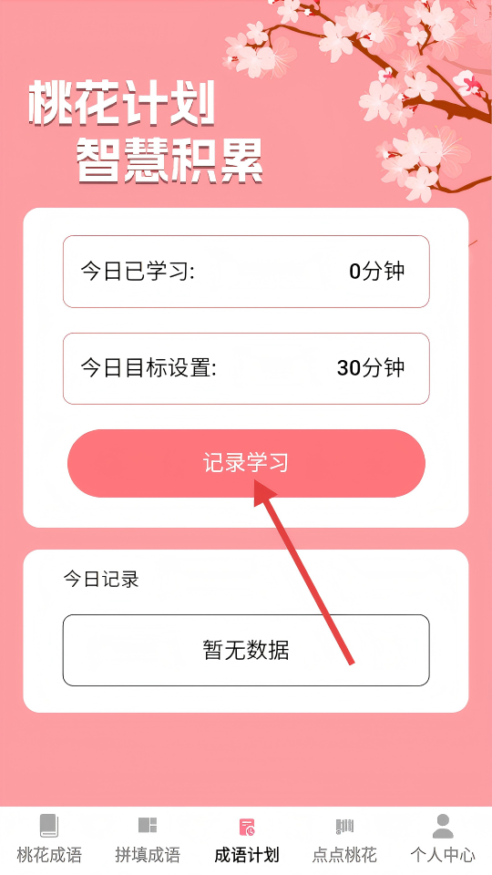 2、在【桃花计划智慧积累】页面,点击【记录学习】按钮。