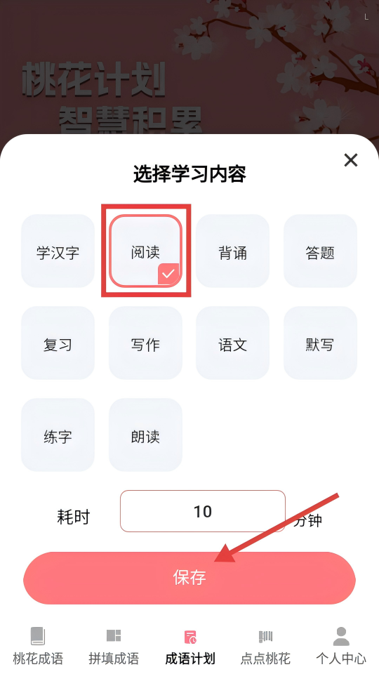 3、在选择学习内容弹窗中,选择学习内容,设置耗时后点击【保存】按钮。