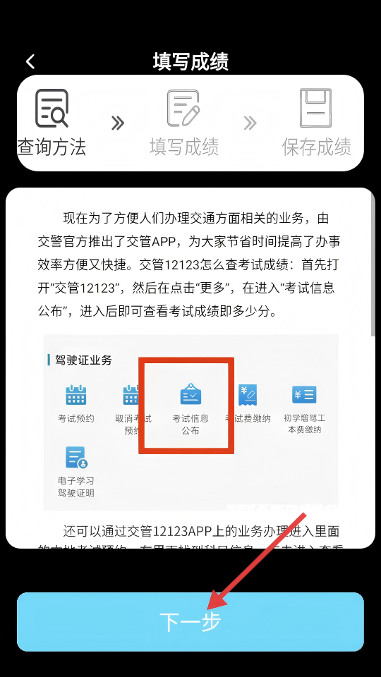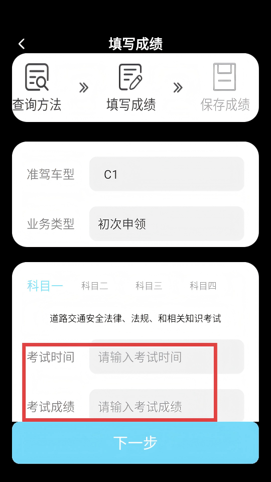 4、在【填写成绩】页面,输入【考试时间】和【考试成绩】,点击下一步。