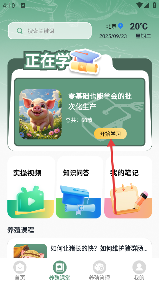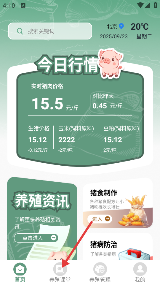 1、打开应用,在首页中点击底部【养殖课堂】。