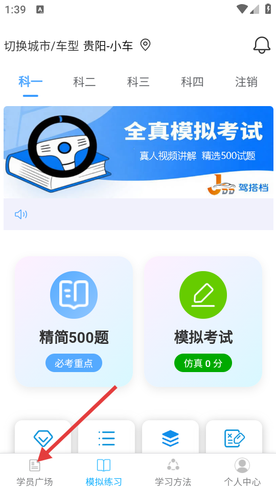 1、打开APP,点击底部【学员广场】,进入学员广场页面。