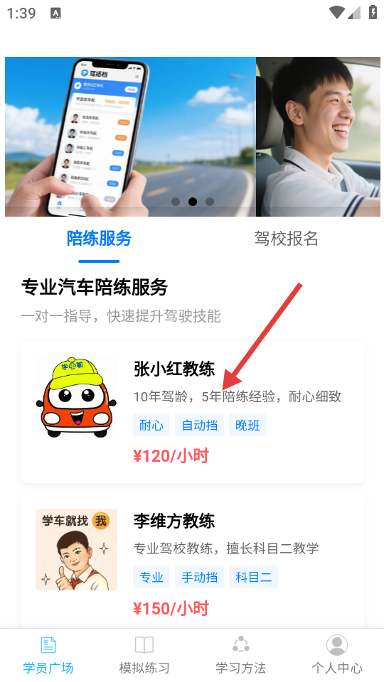 2、在学员广场页面,选择心仪的教练,点击进入教练详情页。