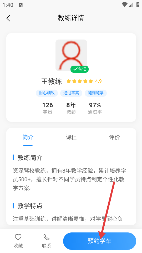 3、在教练详情页,点击【预约学车】,进入预约学车页面。