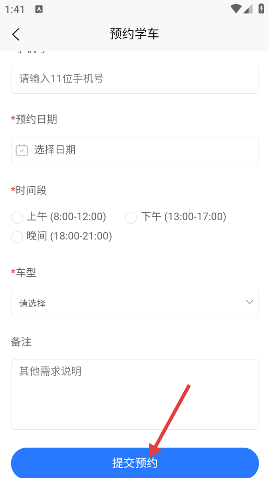 4、在预约学车页面,选择预约日期、时间段、车型等信息,添加备注后,点击【提交预约】,完成预约学车操作。