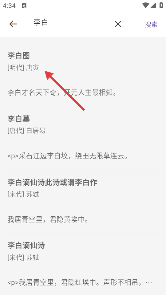 3、在搜索结果中,选择想要查看的李白诗词,点击进入该诗词详情页。