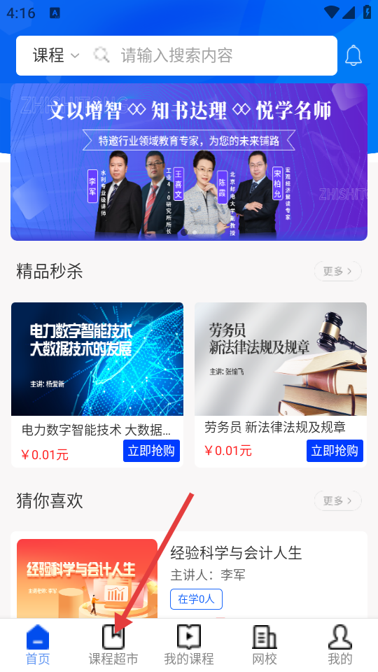 1、打开app,点击底部的【课程超市】选项,进入课程超市页面。