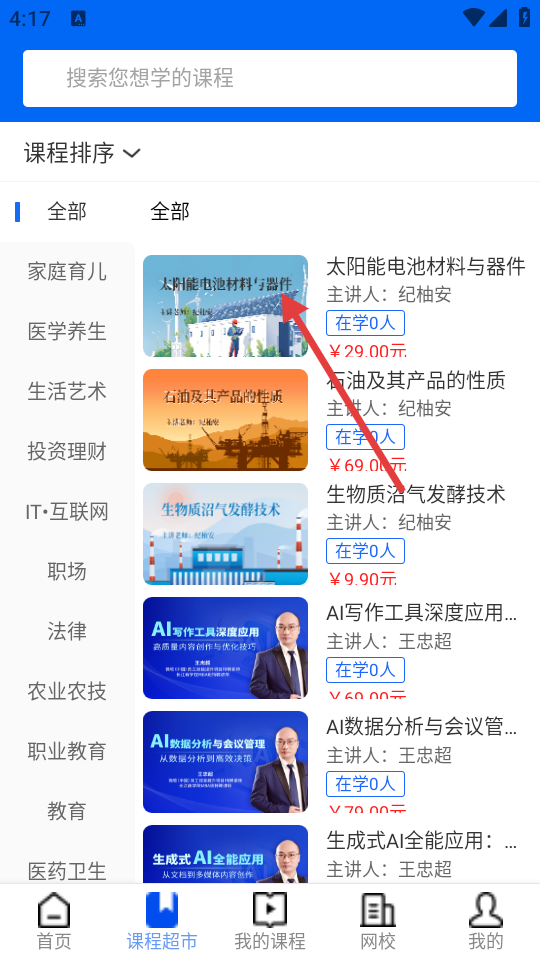 2、在课程超市页面,选择要购买的课程,进入该课程详情页面。