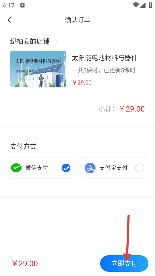 4、在确认订单页面,选择支付方式后,点击【立即支付】按钮,完成课程购买。