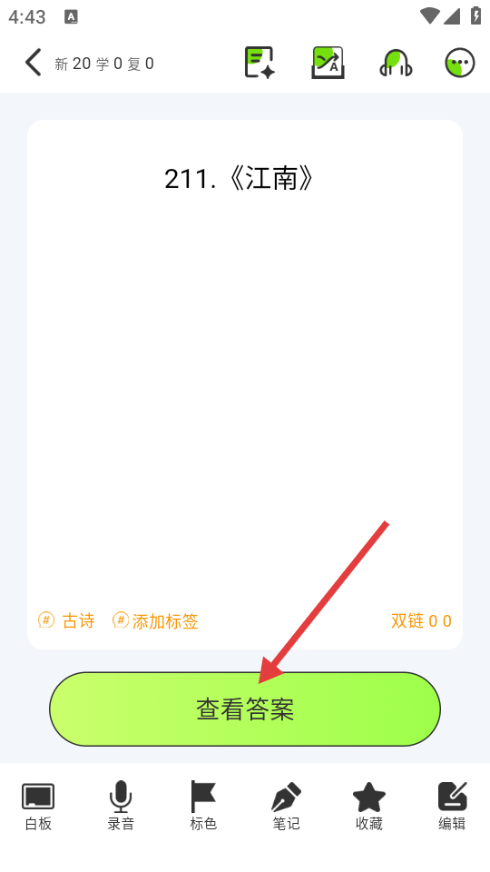 4、在古诗卡片学习页面,可查看古诗题目进行记忆训练,点击【查看答案】按钮,可查看该古诗的具体内容。