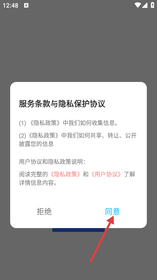1、点击【同意】,接受服务条款与隐私保护协议,进入软件主界面。