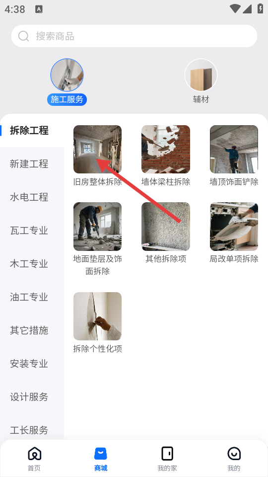 2、在商城页面,选择“旧房整体拆除”服务,进入该服务详情页。