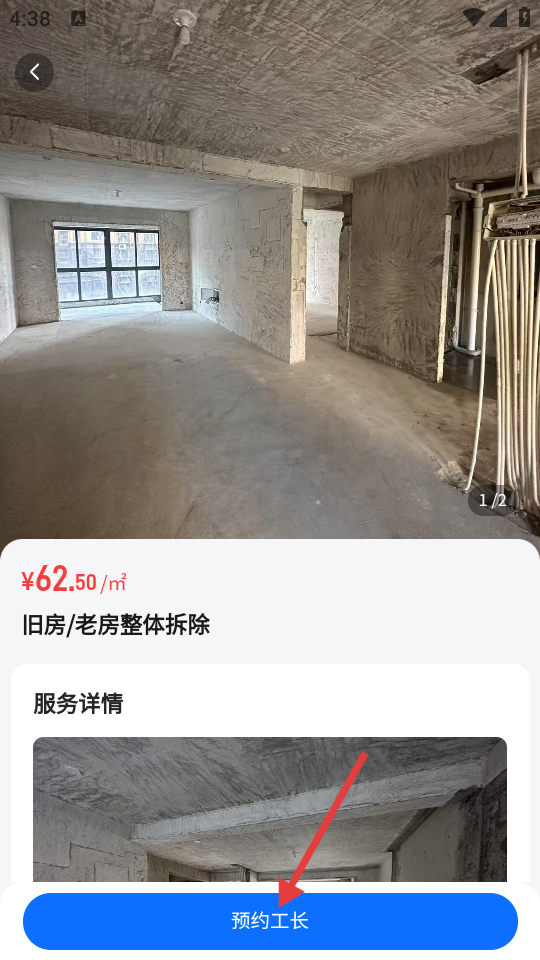3、在服务详情页,点击【预约工长】,进入预约工长页面。
