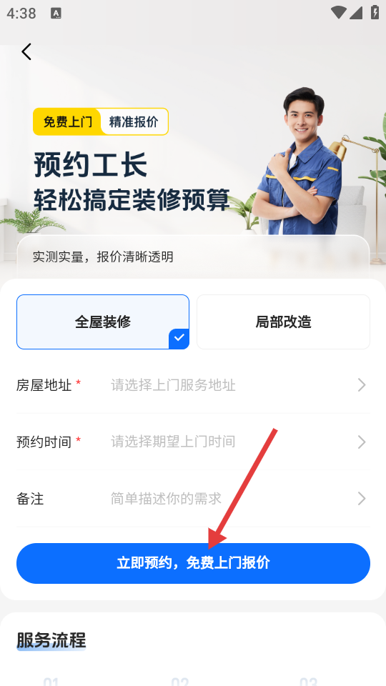 4、在预约工长页面,选择装修类型,填写房屋地址等信息后,点击【立即预约,免费上门报价】,即可完成预约。