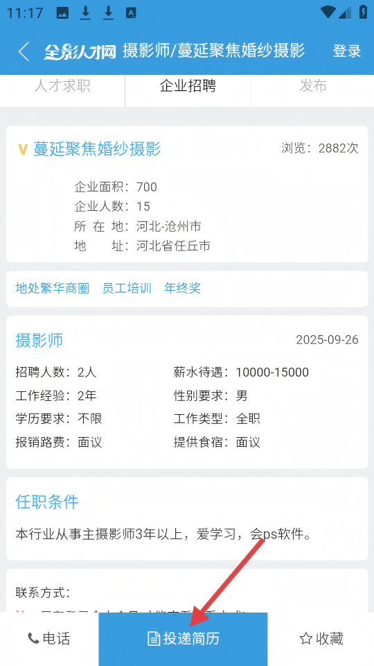 4、在【蔓延聚焦婚纱摄影】的招聘详情页,点击【投递简历】,进行简历投递。