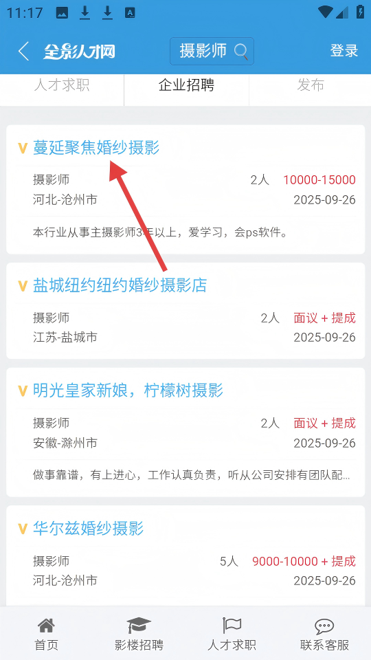 3、在【全影人才网】的企业招聘列表中,点击【蔓延聚焦婚纱摄影】,进入该企业招聘详情页。