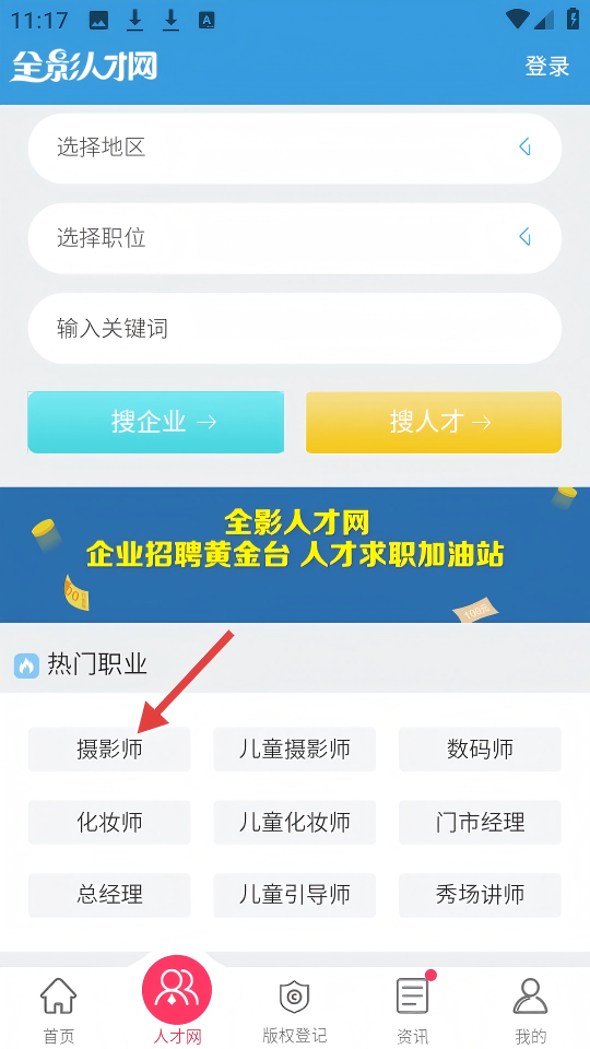 2、在【全影人才网】的人才网页面,点击【摄影师】,查看摄影师相关岗位。