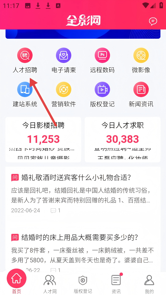 1、在【全影网】首页,点击【人才招聘】图标,进入招聘相关页面。